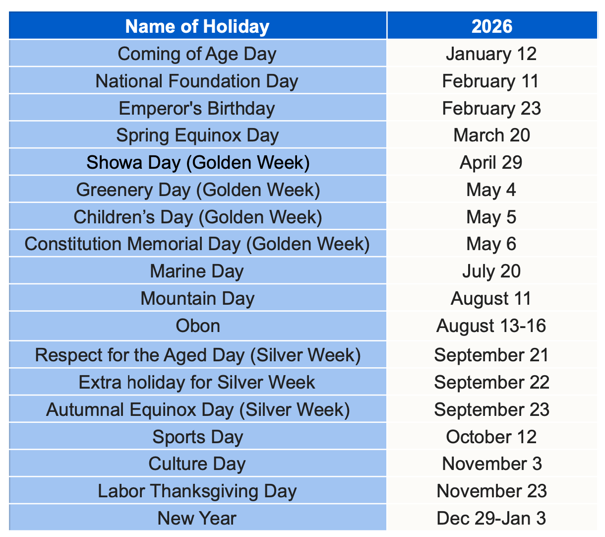 Nachfolgend die japanische Feiertagsliste für das Jahr 2026.