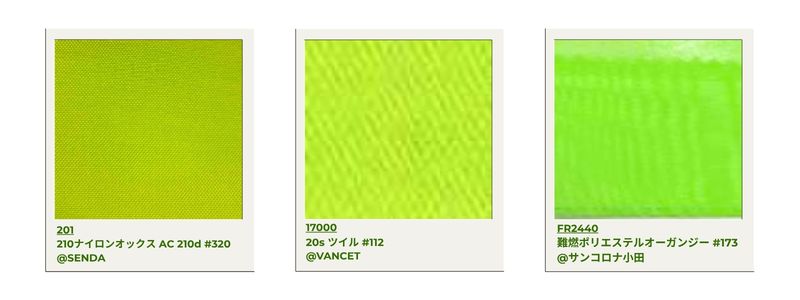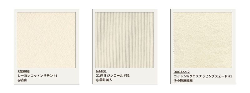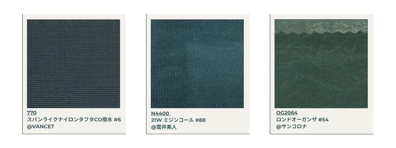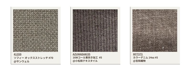 Dieses Material gilt in Japan als schwierig herzustellen, da es für leichten Denim verwendet wird. Durch sorgfältige Kontrolle der Farbstoffkonzentration werden drei Farbvarianten erzielt.